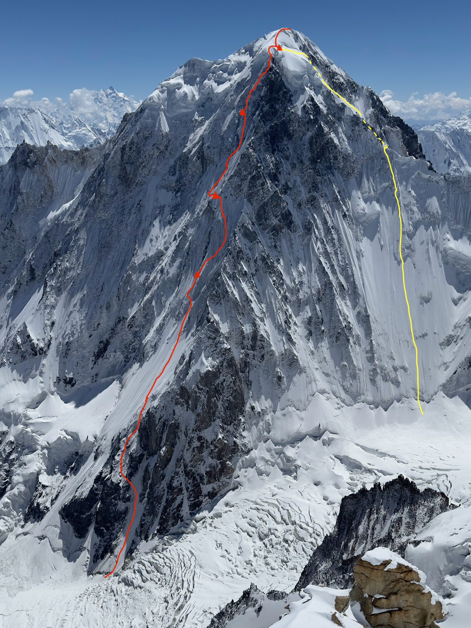 jour, ils ont vu leur ligne prévue - un dièdre raide à travers le mur sommital - balayée par l’effondrement d’un énorme champignon. L'échec semblait proche, mais le lendemain matin, après un rappel diagonal vers la gauche, ils ont pu s’engager sur une voie alternative sur le côté gauche de ce mur sommital, s'arrêtant à mi-chemin à 6 200 m pour faire « le bivouac le plus aérien de notre vie ». Le 22, un terrain mixte difficile et des formations neigeuses surréalistes les ont menés à l'arête sommitale, où une crevasse luxueuse leur a permis de bivouaquer à l’horizontale.